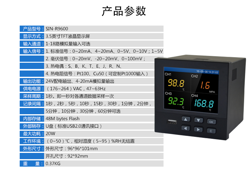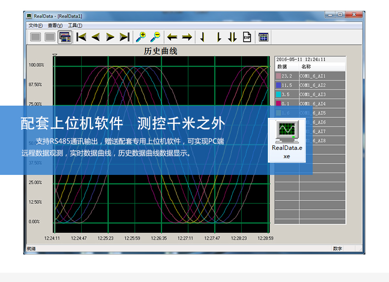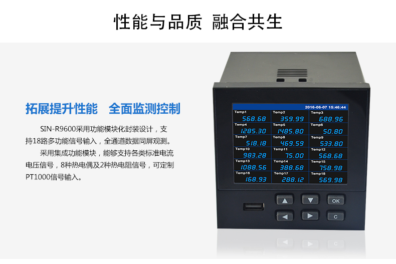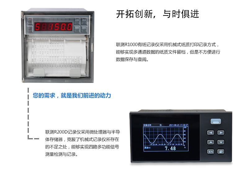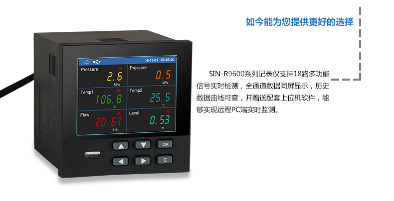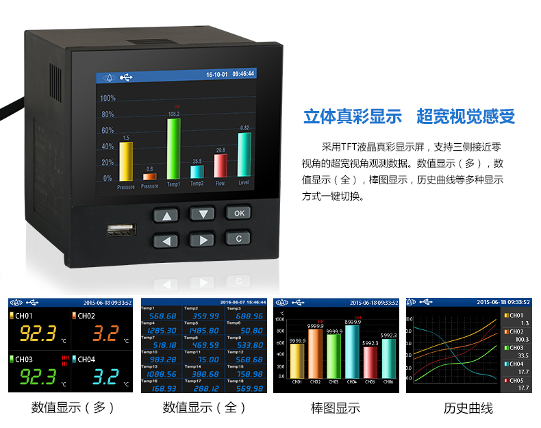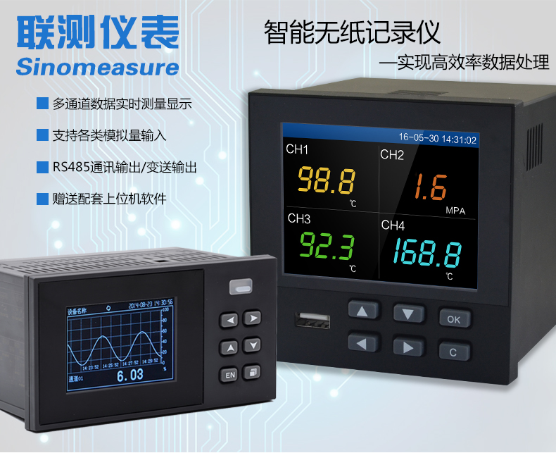 无纸记录仪是将采集的数据/运算数据以时间为基轴记录在仪器内部的存储系统中,无消耗任何常用的记录设施,如:纸张、笔墨。记录在仪器内部的存储数据,通过运算、模拟后显示在液晶屏。常用显示用液晶屏比较广泛。在液晶屏屏幕上,可以显示数字显示、棒图显示、曲线显示、报警列表等。无纸记录仪采集的数据,常用的有:温度、压力、流量、液位、电压、电流、湿度、频率、振动、转速等。