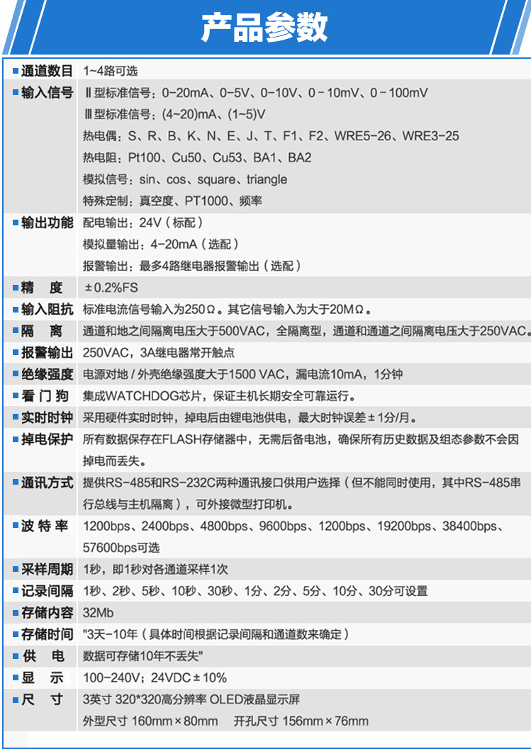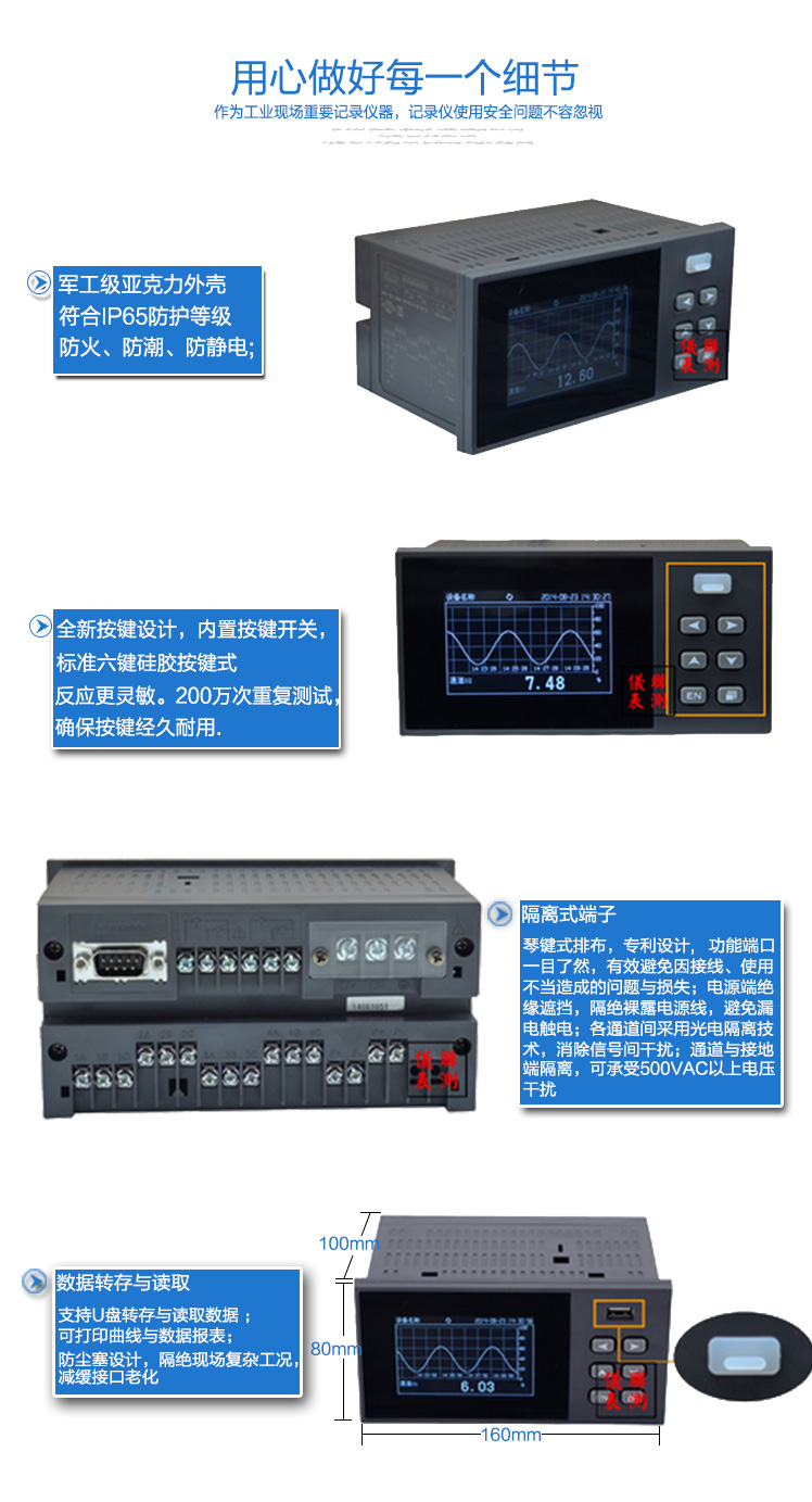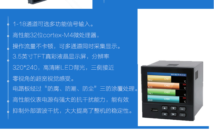 无纸记录仪是将采集的数据/运算数据以时间为基轴记录在仪器内部的存储系统中,无消耗任何常用的记录设施,如:纸张、笔墨。记录在仪器内部的存储数据,通过运算、模拟后显示在液晶屏。常用显示用液晶屏比较广泛。在液晶屏屏幕上,可以显示数字显示、棒图显示、曲线显示、报警列表等。无纸记录仪采集的数据,常用的有:温度、压力、流量、液位、电压、电流、湿度、频率、振动、转速等。